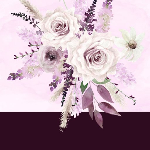 Design apresenta um elemento floral impresso em tons roxos, violetas, lilases e brancos sobre folhas de folhagem e flores de rosa de pénia sobre fundo de lavanda. Excelente para as comemorações do casamento!