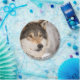 Animais, vida selvagem, festa de aniversário selvagem, lenhador. Foto de uma cabeça de lobo. Um lobo amigável com um sorriso no rosto. É inverno com fundo branco de neve. Um prato para a festa de aniversário 7 de um menino. Com o texto: Feliz Aniversário (x2) Modelo para o nome da criança, letras negras. Texto curvo.