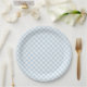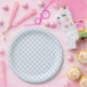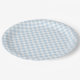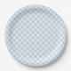 Prato de papel para festa é mostrado em uma estampa xadrez azul e branco fofo.