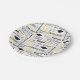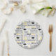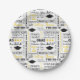 Pratos de papel para festa mostrados com uma celebração de gorros de formatura e mensagens impressas.