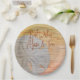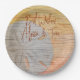Pratos de papel com desenho de dólar de areia no estilo madeira. Use para qualquer festa com tema de praia ou eventos de casamento onde um tema de praia é necessário. Os pratos vêm em duas formas e dois tamanhos, com tigelas como opção também.