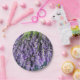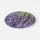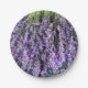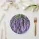 Um conjunto de pratos de papel com uma fotografia de hastes de lavanda. Belo Tema Roxo!