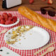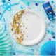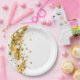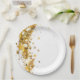 Este prato de papel é mostrado em uma cor sólida branca com um design de estrelas douradas impressas festivas de Natal.