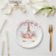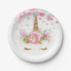Pratos de papel de unicórnio com adorável rosto de unicórnio com cílios e chifre dourados em um lindo fundo floral rosa e bolinhas. Estes adoráveis pratos de papel de unicórnio são facilmente personalizados com o texto de sua escolha, e você pode adicionar uma cor de fundo e remover os pontos.