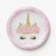 Pratos de papel de unicórnio com rosto de unicórnio cor-de-rosa e dourado com chifre dourado elegante e orelhas e olhos usando uma coroa de rosa cor-de-rosa pastel em um belo fundo rosa pastel. Estes pratos de papel de unicórnio fofos podem ser personalizados com texto e você pode adicionar uma cor de fundo.