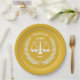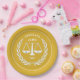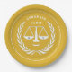 Pratos para festa de formatura na faculdade de direito com balanças-da-justiça personificadas criativas. Para personalizar, edite o texto para adicionar o nome do advogado.