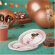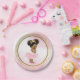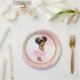 Pratos de papel para chá de bebê de princesa com adorável bebê princesa negra vestindo tutu rosa e colar de pérolas em um belo fundo rosa e dourado. Estes adoráveis pratos de papel para chá de bebê de princesa são facilmente personalizados com texto. Você também pode mover o bebê conforme necessário.