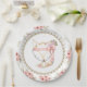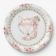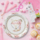 Pratos de papel para chá de bebê de raposa com adorável raposa bebê menina em um lindo fundo floral rosa e dourado. Estes adoráveis pratos de papel para chá de bebê de raposa menina são facilmente personalizados com texto.