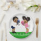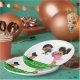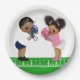 Pratos de papel para chá de bebê de futebol com adorável menino e menina afro-americanos étnicos vestindo adoráveis roupas de futebol rosa e azul em um fundo de cor escolhida por você. Esses adoráveis pratos de papel para chá de bebê de futebol são facilmente personalizados para o seu evento, simplesmente adicionando o texto de sua escolha.