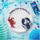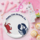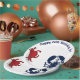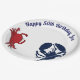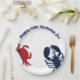 Pratos de papel de lagosta e caranguejo com texto personalizado para qualquer ocasião. Os pratos brancos vêm em dois tamanhos e têm texto azul-marinho curvado na parte superior. Uma única lagosta azul e um caranguejo vermelho decoram o prato. As cores vermelho, branco e azul podem ser usadas para o dia 4 de julho.
