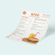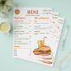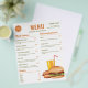 design de modelo de comida de lista de preços de menu de para um restaurante ou um vendedor de comidas de rua com a ilustração de Destei de alguma comida rápida incluindo uma bebida de laranja com palha vermelha, um cachorro quente com ketchup e mostarda no topo e um hambúrguer que tem um pão de sésamo cheio de queijo, alface, carne, tomate, ketchup e picles. Há várias áreas de texto personalizáveis para listar diferentes tipos de refeições e outras opções de menu. No topo há até um ponto para um logotipo personalizado. Personalize esta design para corresponder às necessidades da sua empresa.