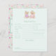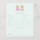 Peça aos seus convidados chás de fraldas que preencham estas lindas predições de bebês e cartões de aconselhamento que apresentam uma ilustração bonita desenhada à mão de dois ursos peludos vestindo vestidos e chapéus de rico e tendo uma festa de chá. Este adorável cartão de conselho de festas de chá de ursinho de pelúcia faz uma maravilhosa manutenção e é uma atividade divertida para o seu chá de fraldas temático de festa de chá! A parte de trás desta carta apresenta um rosa de cor d'água verde pintado à mão, chaleiras, e um padrão de chaleiras que é giro e branco.