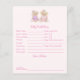 Peça aos seus convidados chás de fraldas que preencham estas lindas predições de bebês e cartões de aconselhamento que apresentam uma ilustração bonita desenhada à mão de dois ursos peludos vestindo vestidos e chapéus de rico e tendo uma festa de chá. Este adorável cartão de conselho de festas de chá de ursinho de pelúcia faz uma maravilhosa manutenção e é uma atividade divertida para o seu chá de fraldas temático de festa de chá! A parte traseira desta placa apresenta um padrão de rosa floral de cor d'água pintado manualmente que é giro e branco.