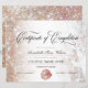 Elegante curso de prêmio de certificado de conclusão de tendências, com fundo de mármore e rosa de ouro de brilho e script de caligrafia manuscrito ''certificações de conclusão''. Personalize com detalhes do curso e um nome.