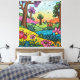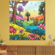 The background unfolds with rolling hills depicted in distinct bands of vivid greens, oranges, and pinks, creating a layered and almost quilted appearance. A flowing blue body of water meanders through the midground, its surface reflecting a bright, almost iridescent quality.