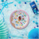 Uma rosquinha de bolo com glacé de baunilha e borrifos coloridos em uma placa rosa. Bonita e elegante.