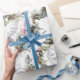 Uma Alice bonita na colagem do país das maravilhas, com Alice, o gato de Cheshire, o coelho branco, o Hatter louco, o copo de chá do vintage, o bule, e o relógio de bolso, é ajustada em um fundo das imagens do vintage do azevinho arranjadas em linhas diagonais no branco faz um Natal simplesmente elegante e bonito e um papel de envolvimento temático literário.