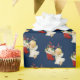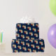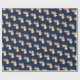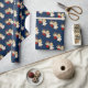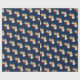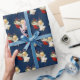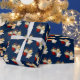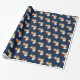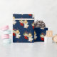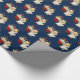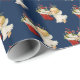 Papel de embrulho de presente de Natal mostrado com um impressão de anjo giro num fundo azul profundo.