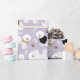 Cão-de-bichão-gato frita em suéteres e arcos com ossos de cão espalhados e estampas de pata num fundo púrpura claro.