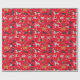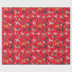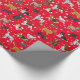 Papel de embrulho de férias para amantes de cães. Ele apresenta ilustrações de resgates de ouros, collies de fronteira, Jack Russell terriers, spaniels, cabelos, beagles, Dalmatianos, rabiscos de ouro, resgates de labrador e raças mistas - tudo entre flocos de neve e contra fundo vermelho.