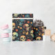 Celebre o Halloween em estilo com nosso vibrante papel de embrulho de Halloween, com um fundo preto impressionante, enfeitado com crânios coloridos e intricadamente decorados em laranja, vermelho, azul e branco. Envolvido com laranjas brancas e flores amarelas e cipós, este padrão atraente oferece uma mistura perfeita de elegantes e brincalhões para todas as suas necessidades assustadoras de dar presentes. Ideal para festas, presentes e decoração sazonal!