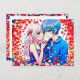Personalizado, obrigado, anotações para seu casamento temático de anime. Flores vermelhas, azuis e brancas e um casal de anime fofo abraçando-se.