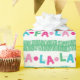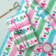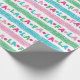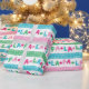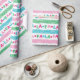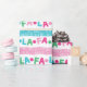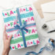 Um pequeno retrato e um pequeno gatinho, este papel de embrulho cômico apresenta terras coloridas de Natal. As terras alternadas soletram "fa la". As cores incluem: azul, vermelho, rosa, verde. Em branco. Vem num rolo contínuo. Perfeito para o Natal/Natal.