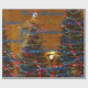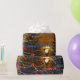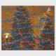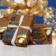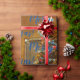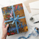 Feliz na moda de Natal, tipografia azul, com árvores de Natal animadas em frente a um prédio com luzes de parede repetindo o padrão design para sua alegria festiva.