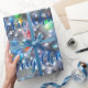 Feliz na moda de Natal, tipografia azul, com uma vibrante árvore de Natal, com ornamentos verdes, vermelhos, amarelos e azuis e um design de padrão voador colorida e nevado do céu à noite.