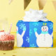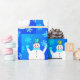 Presentes especiais de férias embrulhando papel com um bonzinho de neve e flocos de neve felizes.