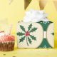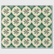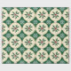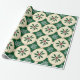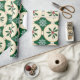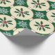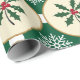 Este design de papel de embrulho apresenta um padrão festivo com imagens alternadas de folhas e bagas sagradas e flocos de neve brancos. As folhas e bagas ocas são representadas em círculos beges com contorno de ouro, colocados sobre um fundo verde-escuro. Os flocos de neve são intricadamente detalhados e colocados nos espaços entre os círculos, criando um design visualmente atraente e equilibrado com o tema de férias.
