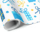 Este papel de embrulho moderno e moderno é fabuloso! Tem presentes de Chanucá alegremente embrulhados em ouro e azul. Pegue o suficiente para enrolar todos os presentes.
