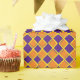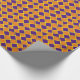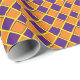 Este papel de embrulho é mostrado com um fundo laranja e um padrão de diamante em azul violeta púrpura e uma faixa amarela mais fina.