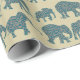 Um giro divertido de Giftwrap, com filas de silhuetas elefantes, cheias de um padrão azul escuro e de Paisley Burgundy, em um fundo bege. Parte da coleção Posh & Painterly 'Heffalumps'.