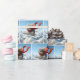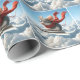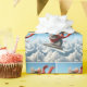 Um pequeno rato vestindo óculos de aviador e um cachecol vermelho percorre um avião de papel através das nuvens