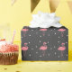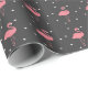 Papel de embrulho Flamingo com um padrão de flamingos cor-de-rosa e corações cor-de-rosa em fundo de cinza.