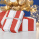 Presente de Natal embrulhando papel vermelho e branco. Cores de Natal.
