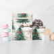 O papel de embrulho colorido mostra carros encantadores ao lado de árvores de Natal lindamente decoradas com arcos vibrantes, evocando um espírito alegre de inverno para dar presentes de Natal.