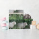 Este belo papel de embrulho apresenta uma fotografia de uma ovelha fofa e fofa. As ovelhas estão cercadas por flores silvestres e erva comprida e comem algumas folhas de forma vertiginosa. Tem um casaco de lã branco grosso e um nariz preto fofo.