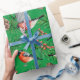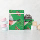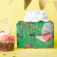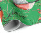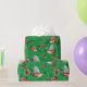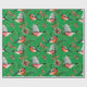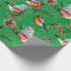 O papel de embrulho festivo apresenta pássaros tremoços vermelhos com cones de pínus e galhos verdes em fundo verde.