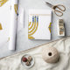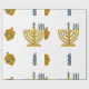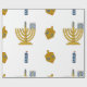 Um papel de embrulho Chanukah com gráficos Chanukah desenhados à mão de itens para Chanukah, uma menorah Chanukah, um sonho, e velas.