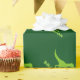 Um papel de embrulhamento de dinossauros Verdes, bonito, personalizado com o nome das crianças. Design de plástico pré-histórico para a festa de primeiro aniversario, chá de fraldas, natal, etc., para crianças de garotos pequenos. Faça um para filho, neto, novo bebê, neto, nova mãe, nova mãe para ser, recém-nascido, etc. Ilustração pré-histórica de desenho animado para crianças. Engraçado Tyrannosaurus rex.