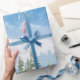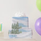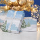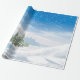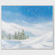 A design apresenta o frio tempo e a neve que caem nas montanhas, árvores e lago. Lindo cenário de inverno para empacotar papel.
