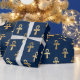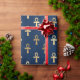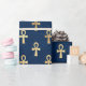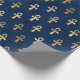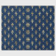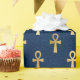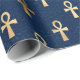 O papel de embrulho na moda apresenta um padrão de símbolos de tornozelo egípcio dourado sobre fundo azul escuro. O tornozelo também é conhecido como a chave da vida