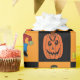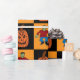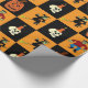 Um design de tabuleiro preto e laranja com uma bruxa sobre uma vassoura, um jack-o-lanterno, um crânio com uma vela, e um Monstro Frankenstein.