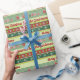 Você pode personalizar este papel de embrulho de Natal com sua própria saudação ou nome. Você também pode removê-lo completamente excluindo o texto "Personalizar aqui". O design apresenta fitas vermelhas e verdes com ilustrações de pacotes envoltos e flocos de neve.
