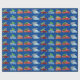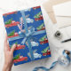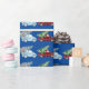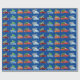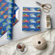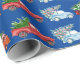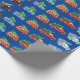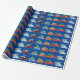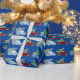Papel Azul de Embalagem de Natal decorado com carros de Natal, furgonetas e caminhões carregandos árvores de Natal e presentes.