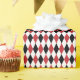 Um papel de embrulho projetado com um padrão de harlequin vermelho-escuro, preto e branco. Personalize a cor branca de fundo entre outras opções.