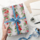 Presente Papel de enrolamento, ornamentos vermelhos e Holly