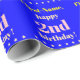 Este simples design de papel de empacotamento de aniversário apresenta uma mensagem como "Nome, segundo aniversário feliz!", onde o nome e o número de aniversário podem ser personalizados. Também apresenta formas decorativas de estrelas. O fundo tem cor azul. Um papel de embrulho como este poderia talvez ser usado para embrulhar presentes que estão sendo dados para celebrar o aniversário de alguém. [~Z0000243]